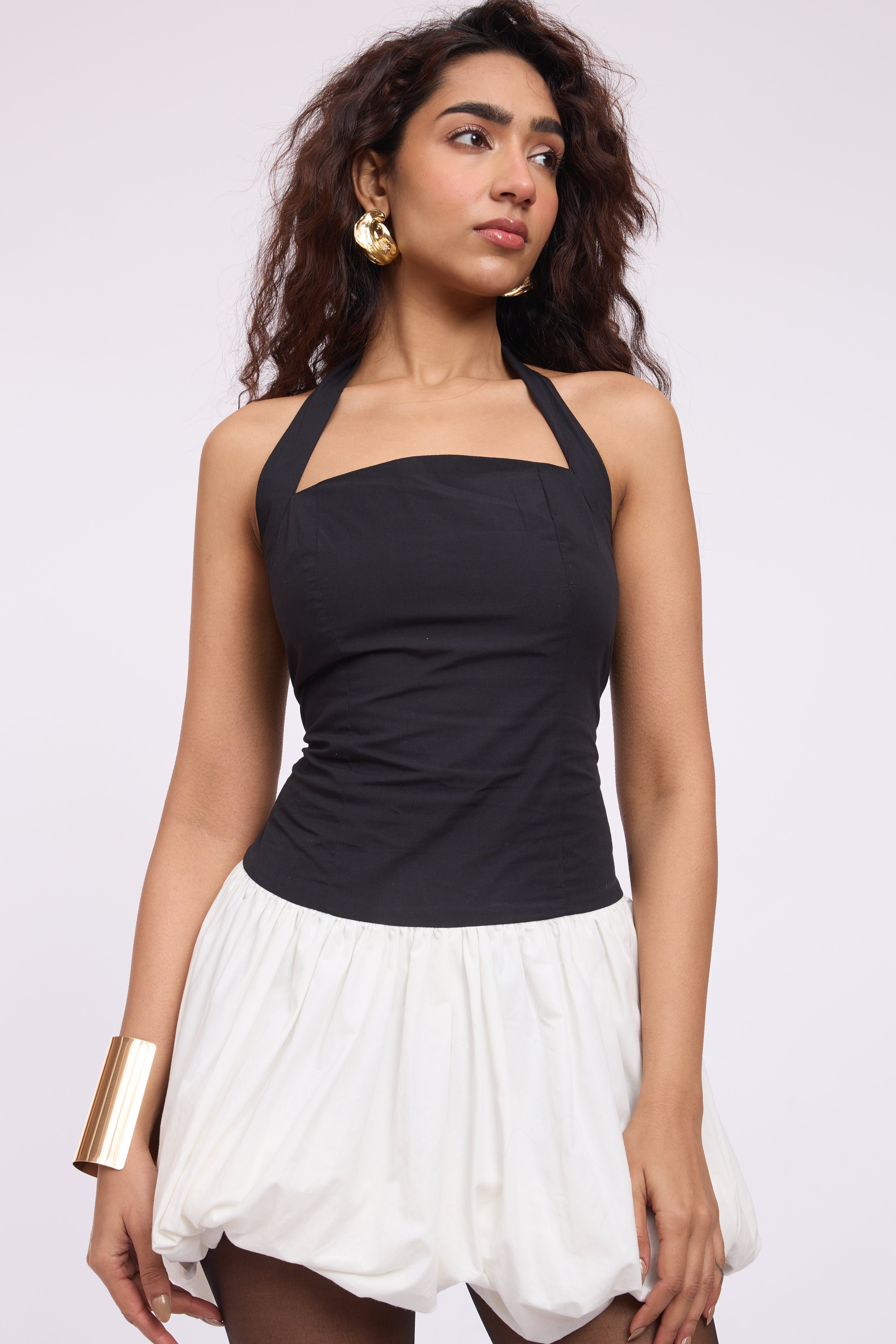 This dress features a halter neckline and a voluminous bubble hem skirt, creating a striking, flattering silhouette. The contrast between the fitted bodice and gathered skirt adds a fresh, modern edge.